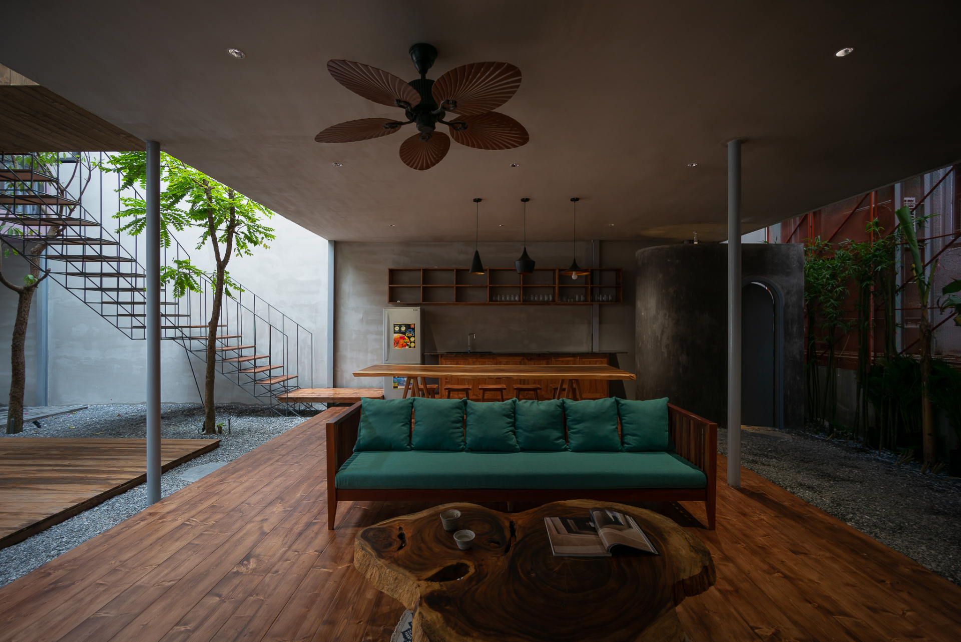 Tầng một của ngôi nhà được thiết kế tinh tế với không gian sinh hoạt chính, bao gồm phòng khách và bếp, mở ra sân sau hướng Đông Nam, giúp đón gió mát từ bờ sông vào không gian bên trong. Điểm đặc biệt ở đây là việc trồng nhiều cây xanh và hồ cá, tạo nên môi trường vi khí hậu mát mẻ và thư giãn cho cả gia đình.