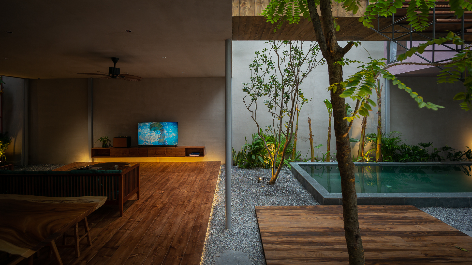 Không gian hiện đại sử dụng gỗ cho trần nhà, tường cùng kết hợp các vật liệu dưới ánh sáng vàng 2700K-3000K mang lại vẻ đẹp ấm cúng của ngôi nhà khi lên đèn.